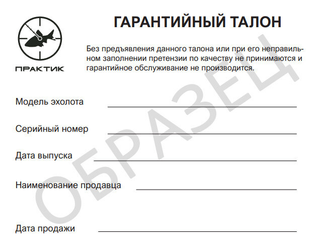 Производитель эхолотов «Практик» несет обязательства по осуществлению гарантийного ремонта эхолокационного оборудования «Практик» в соответствии с Законом «О защите прав потребителей» от 07.02.1992 №2300-1 (ред. от 18.04.2018).