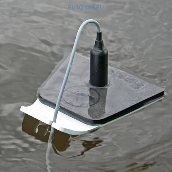 Стандартный датчик эхолота необходимо вставить в фиксатор "Капля" таким образом, чтобы сканирующая поверхность датчика была вровень с нижней границей фиксатора или даже выступала немного (на 1-2 мм).